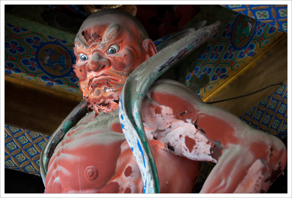 Interamente laccato di vermiglio, forma un arco grazioso la cui raffinatezza contrasta con la natura selvaggia della gola. La leggenda vuole che l’eremita che fondò Nikko abbia attraversato il fiume portato da due serpenti, simboleggiati oggi dal ponte. In epoca feudale solo l’imperatore aveva il diritto di attraversare il ponte. Al di là di esso si apre l’intero sito di Toshogu.