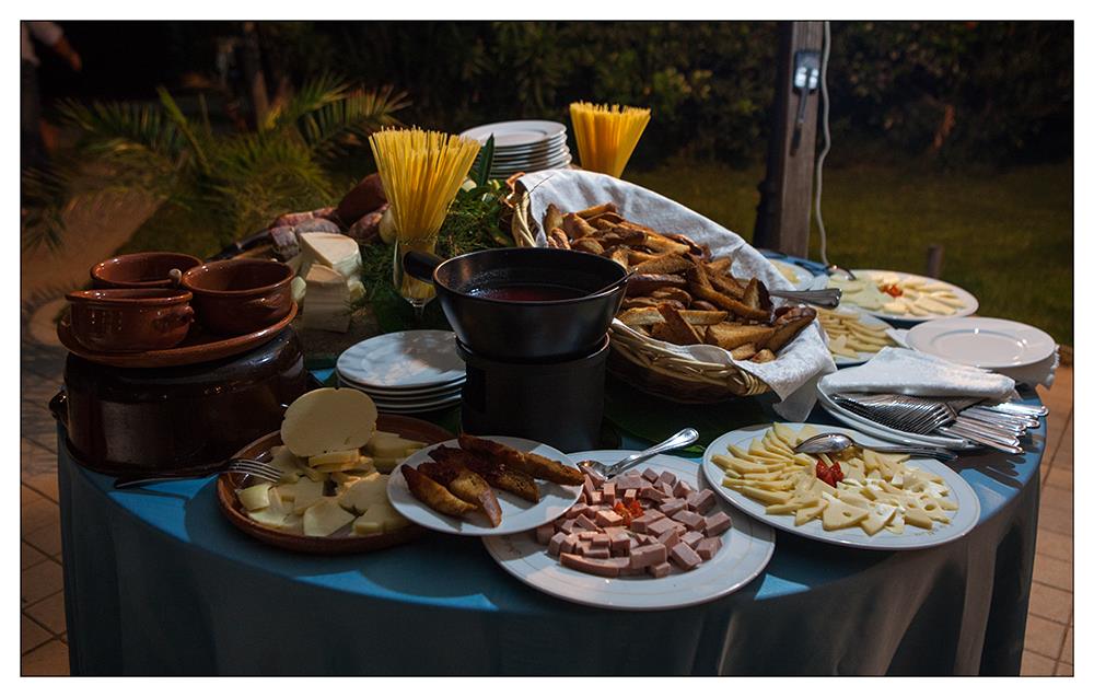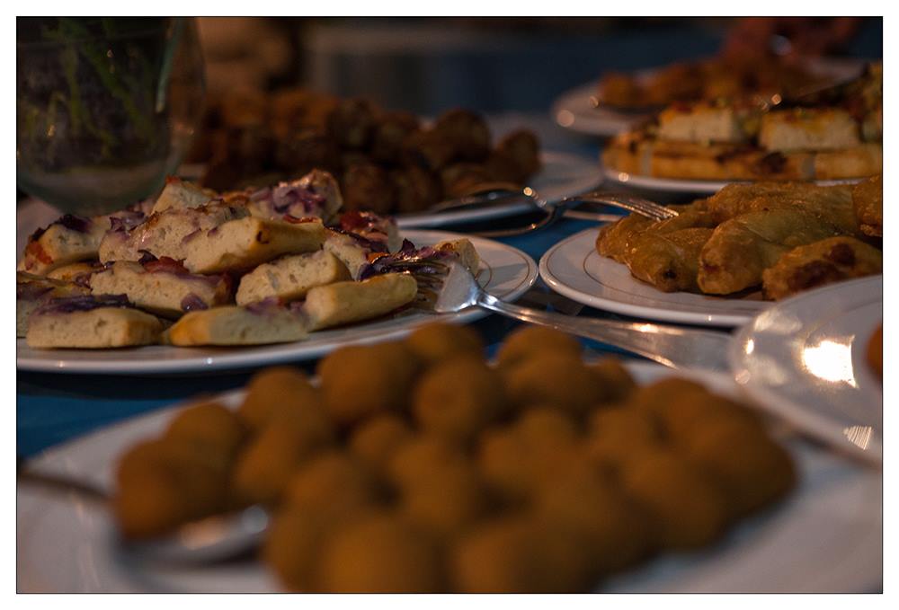 Abbiamo chiesto alla sala ricevimenti di allestire aperitivo e antipasto a buffet, cosa che oggi – a distanza di anni – è la norma, ma all’epoca è stata frutto di ragionamenti. Abbiamo pensato che il buffet, oltre a essere decorativo, permette di mangiare le cose che si scelgono nella quantità che si vuole e in alcuni casi preparate al momento; se la disposizione delle isole è ben fatta, garantisce maggior dinamicità e convivialità senza troppe code. Come sempre, la scelta è stata molto apprezzata da una parte degli ospiti (soprattutto quelli del Nord, curiosi di assaggiare tante cose nuove), e criticata dall’altra (gli ospiti del Sud, più tradizionali e mediamente più anziani).