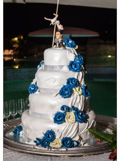 Per la torta nuziale abbiamo richiesto un design che richiamasse il colore tema; il cake-topper l’ha realizzato Leonardo col fimo: rappresentava noi sposi a praticare, in abito nuziale, i rispettivi sport (karate e pole dance).
